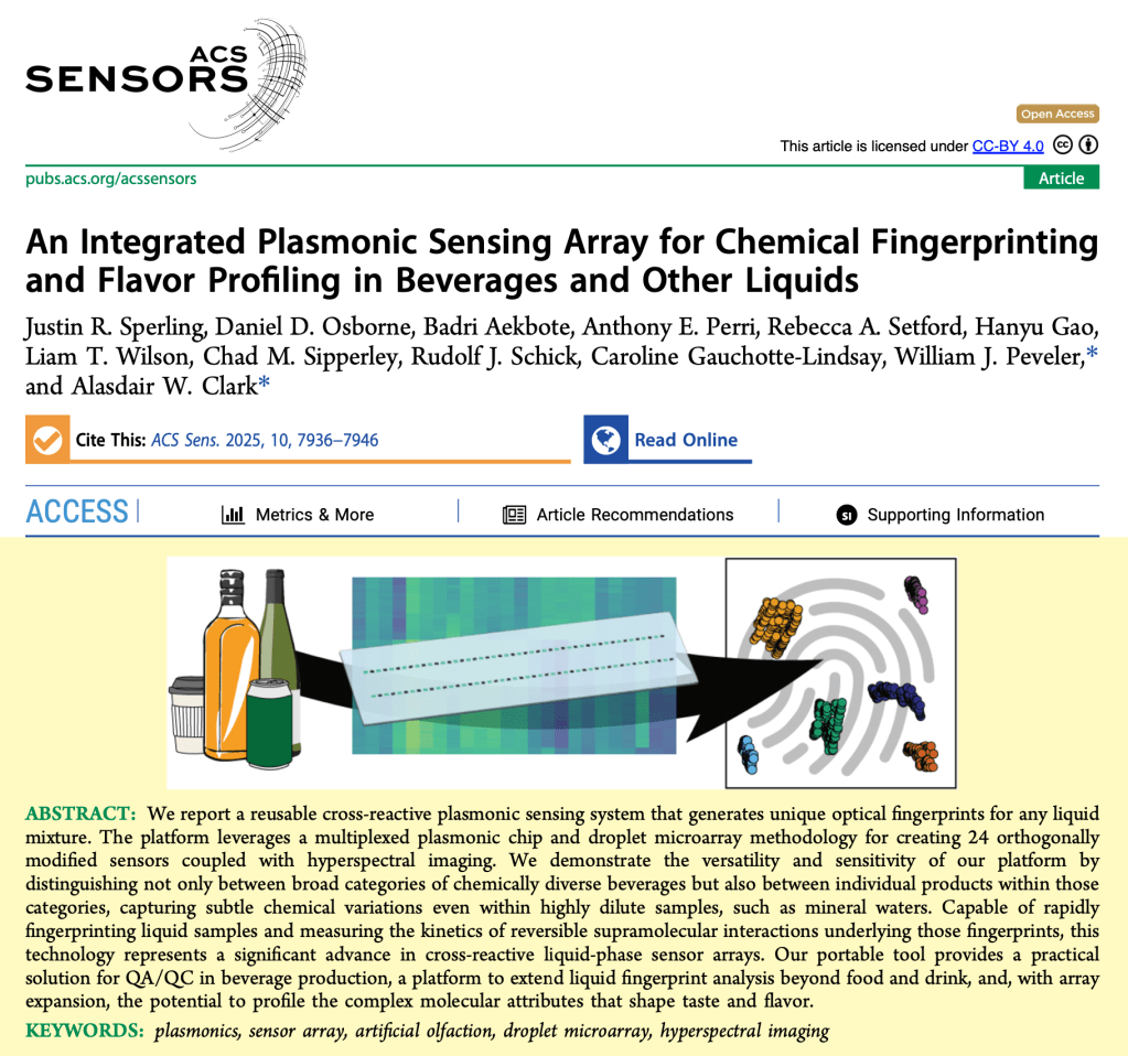 The paper is Open Access and can be found here: An Integrated Plasmonic Sensing Array for Chemical Fingerprinting and Flavor Profiling in Beverages and Other Liquids https://doi.org/10.1021/acssensors.5c02485